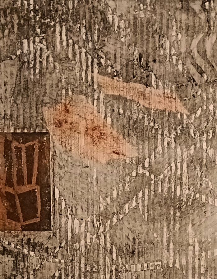Puis le support est gravé avec des gouges, qui façonnent le dessin dont le principe est le même que la linogravure et permet aussi des ajouts plastiques.