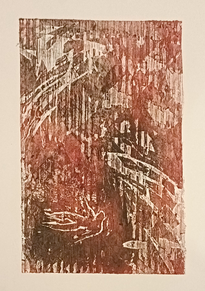 N’ayant pas de presse, je n’ai pas pu continuer à graver sur carton ondulé mais j’ai beaucoup apprécié cette technique.