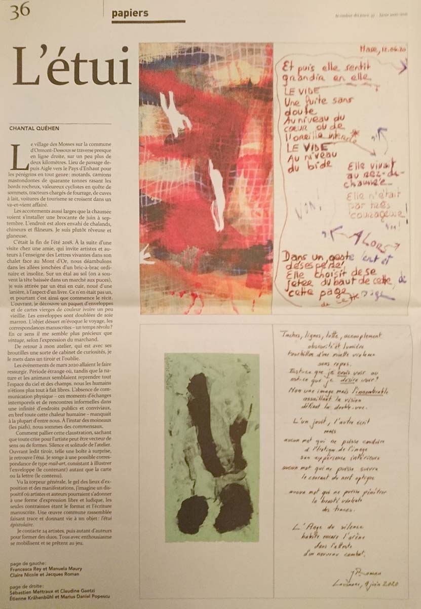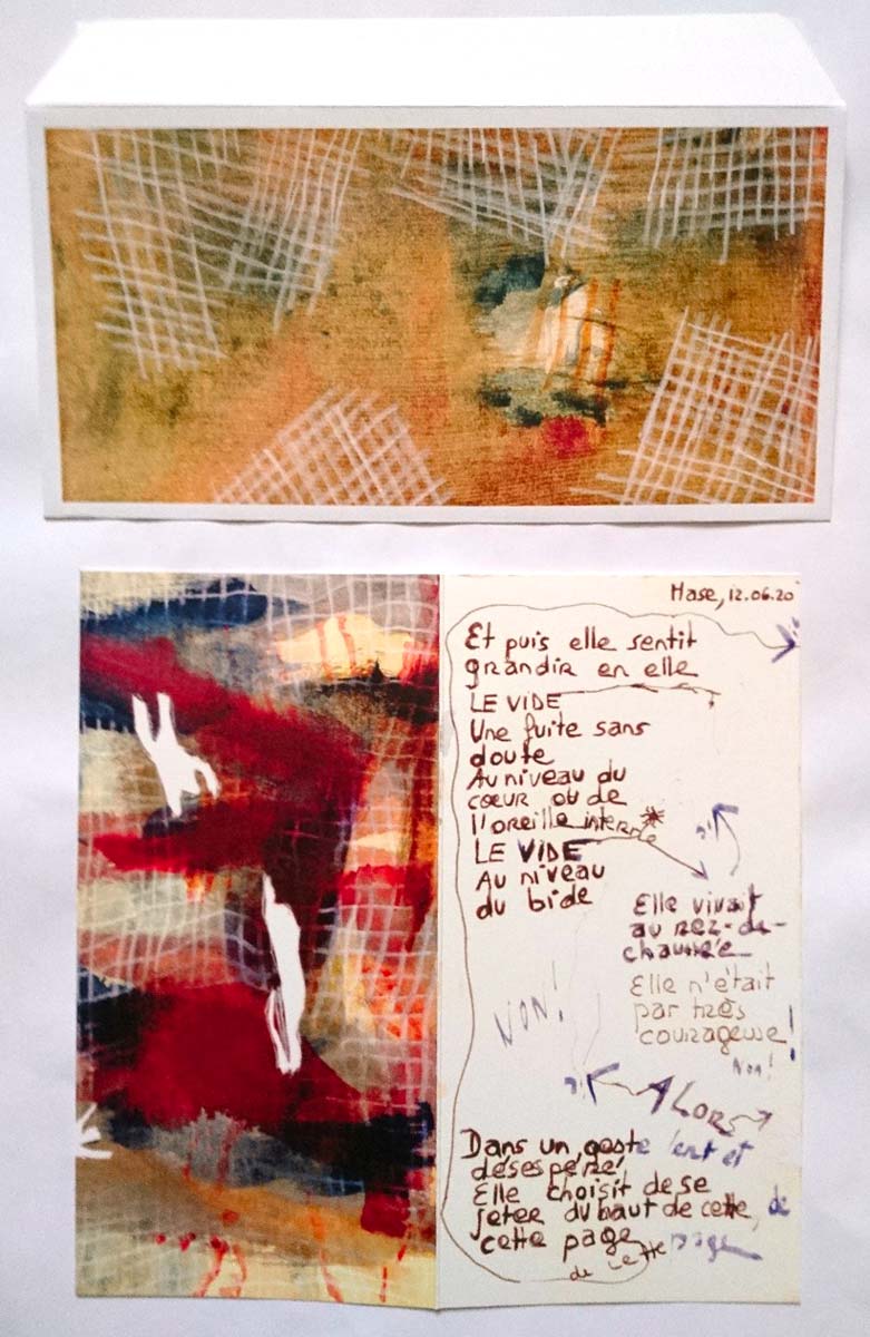 L'ETUI réunit 24 peintres qui ont peint pendant le début de la pandémie une carte avec son enveloppe proposée par Chantal Quéhen, puis 24 écrivains se sont inspirés de ces images pour composer leurs écrits.